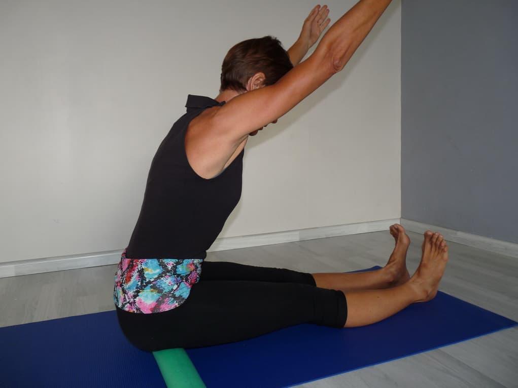 1/ Assis sur votre tapis, jambes longues (si possible tendues), écartées un peu plus que la largeur de votre bassin, pieds flex ; pour un plus grand confort, notamment si vous avez une fragilité au bas du dos ou au niveau du bassin, vous pouvez installer une frite en mousse sous vos fesses, ou encore une serviette roulée, et fléchir légèrement vos jambes. Essayez de vous tenir sur la pointe de vos fesses, comme si vous étiez suspendu, en gardant le dos bien droit. Les mains sont posées de chaque côté des hanches.